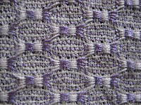 While that looks good, I liked the higher-contrast blue/light pink combination from the previous fabric, so I wove off a section like that as well. Here it is against the darker brown warp.