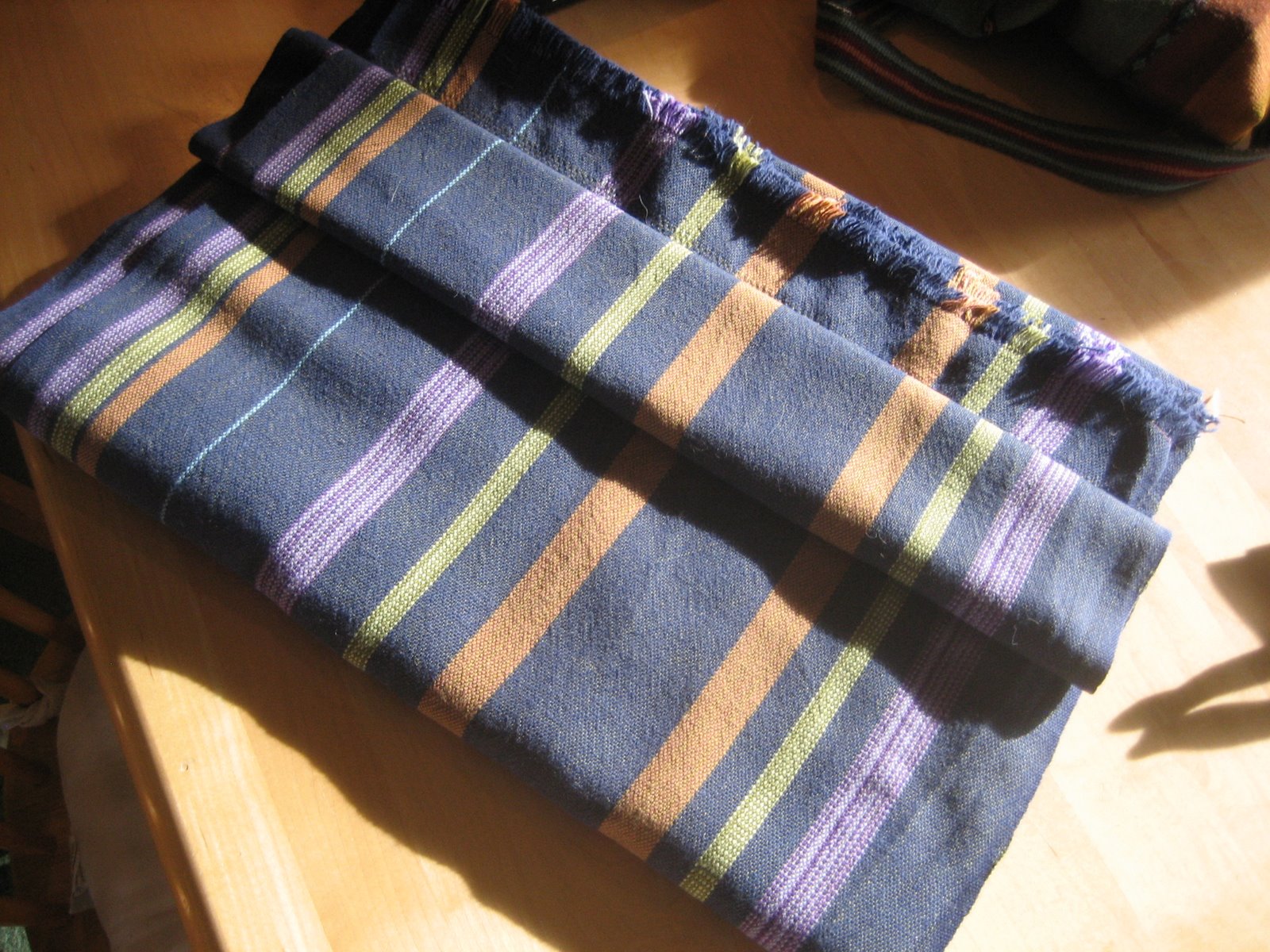 It’s sitting there, on the kitchen table, waiting patiently to be sliced and pieced and hemmed and otherwise expertly manipulated into one of Sara’s lovely kimono jackets. I’ve a cutting diagram, some basic assembly instructions and a set of insides that’ve gone to water. I’m running smack into my biggest and most stifling problem – fear of failure. Fear of ruining this lovely and (only slightly flawed in one little place that I’m sure won’t show if I’m smart) really quite good Cloth. I can make more. It didn’t take long, I have more yarn, and I’ll need to do another because those stripes aren’t symmetrical anyway. But honestly, I’m absolutely paralyzed right now. And why? Because I’m just not very good at sewing. I know how to run the machine, I can sew a straight line and zig-zag with the best of them. I can even do rolled hems. But! It’s the garment construction that I’m simply not proficient at, and that’s what’s causing me so much angst.
