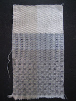 As you can see, I did a few combinations. The bottom is two color and a long treadling repeat to make squares rather than rectangles. The center section is also two colors, highly contrasting and the top is two color but nearly no contrast. They’re all interesting in their own way, but they all have one thing in common. Too open. For sure.