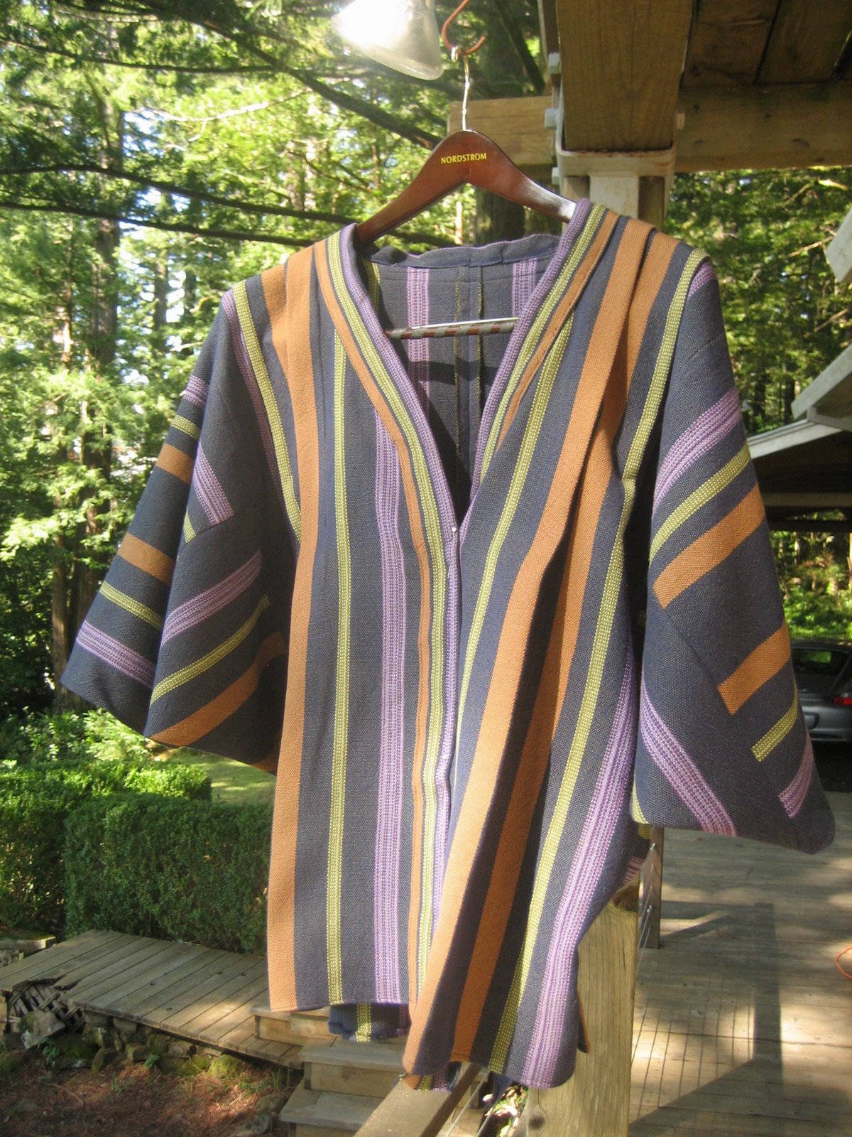 Second, those stripes. They fell in all the wrong places and didn’t line up the way I wanted. The pleats in the shoulders were driven by the stripes. Upon further review, I should have reversed the fabric (green and purple toward the center, brown toward the shoulder) so that I could have highlighted those colors. Or, the stripes need to be smaller. Or I need to not worry about them. The garment absolutely NEEDS the pleats at the shoulder to give it shape – and somehow I need to figure out a better way to utilize them. That’s as much a fabric problem as a garment problem.